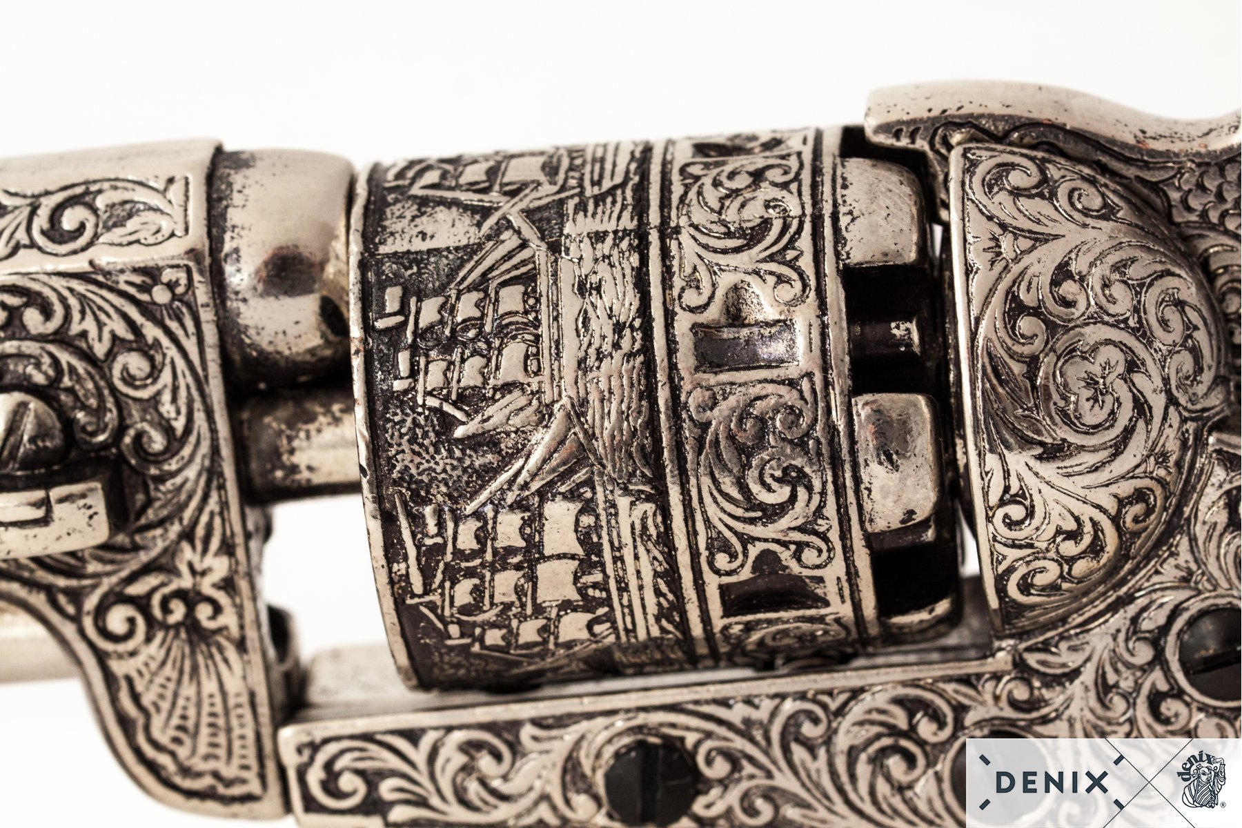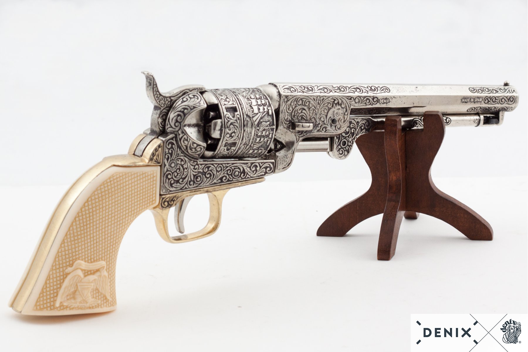 These replicas are made in Spain at a munitions factory to the original specifications. They are made of metal and plastic (grips aren’t ivory of course!) and are the appropriate weight of the originals. These replicas do not fire (although the barrels and triggers move), they are meant for costume play only. Please LARP responsibly.